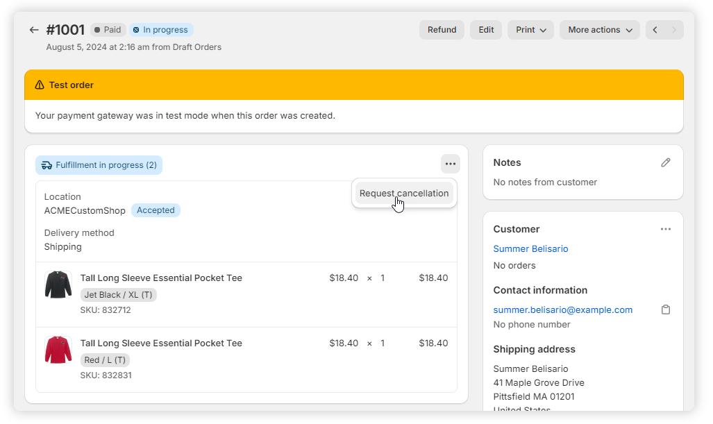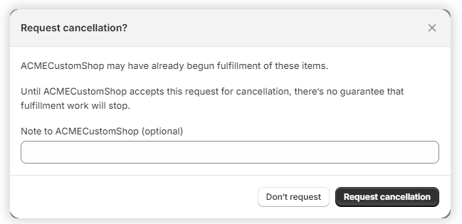 Shopify will prompt you to confirm the cancellation request. You may need to enter a reason for the cancellation