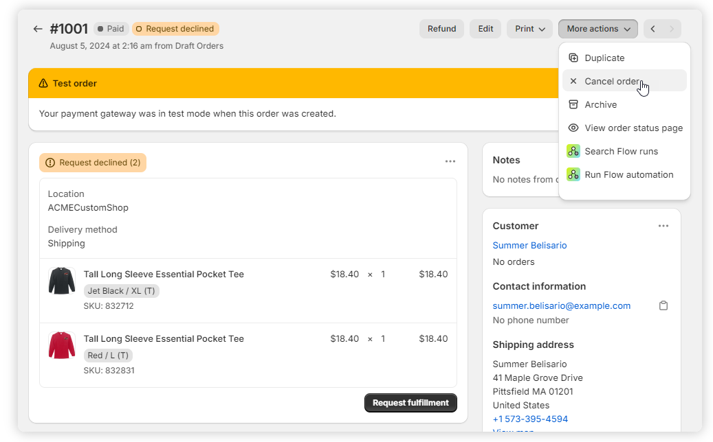 Once you confirm the cancellation, the order status will be updated. The tags "Canceled", "Refunded", "Unfulfilled", and "Archived" will be applied to the order.