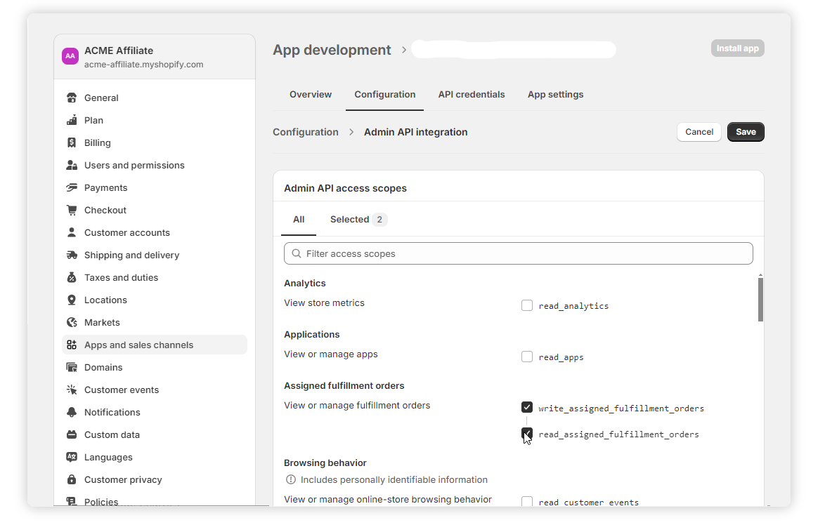 11. Under Admin API access scopes, tick the scopes listed below.