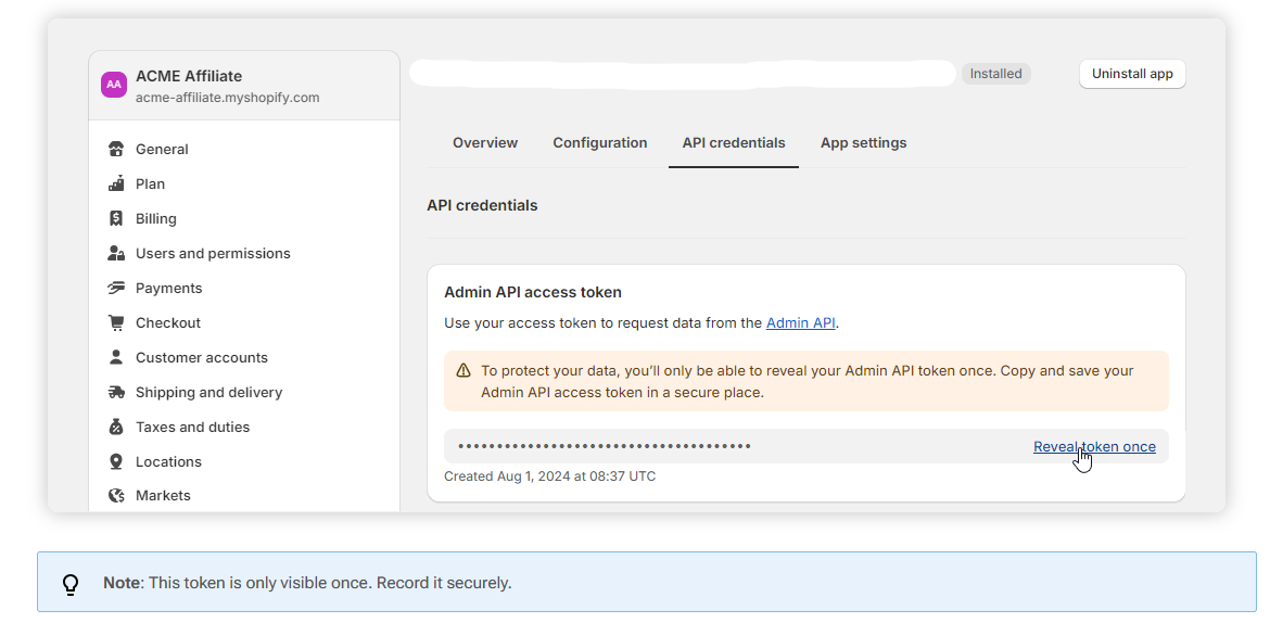 16. Under Admin API Access token, clilck Reveal token once