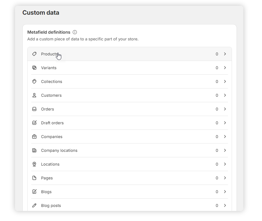 4. Select Products from the Metafield definitions list.
