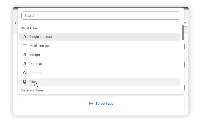 Click on Select type and choose "file" from the list of options. This will allow you to upload design files.
