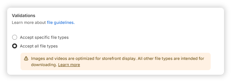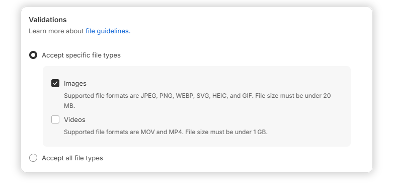 Properly setting up these metafields is essential for ensuring that Visual Ink can accurately map your design files to the correct areas of your products. Verify what file formats are supported and configure the validation rules accordingly. We recommend PDF or hi-res transparent PNG. This step is critical; if the metafields are not set up correctly, it can cause delays in the design mapping process and potentially slow down production.